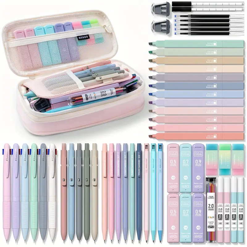 Perfect for aesthetic lovers, this complete pastel stationery set includes pens, pencils, erasers, mechanical lead refills, and more.